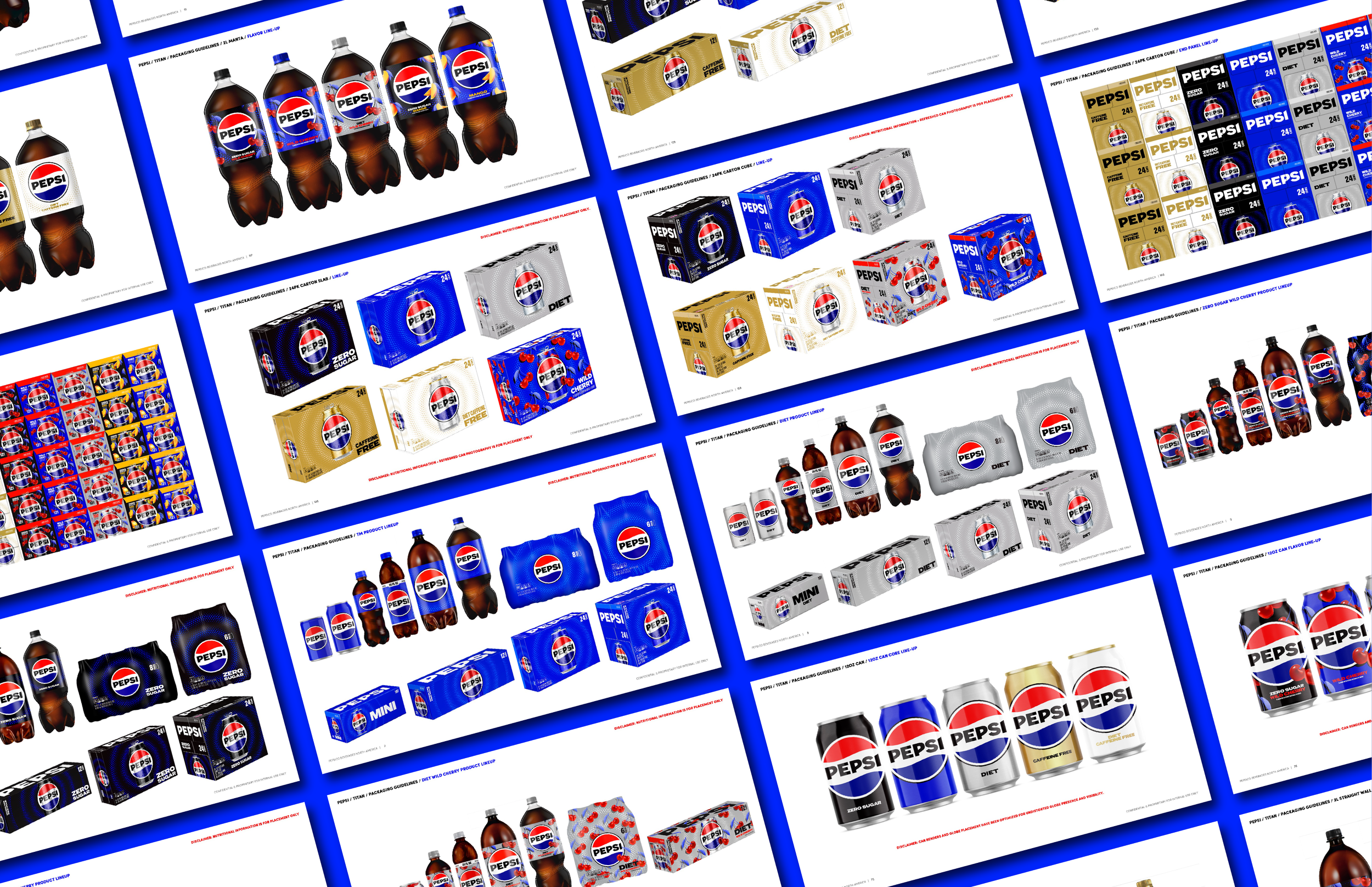 Directed and managed the 360° design rollout for Pepsi’s 2023 rebrand—spanning visual identity, 400+ SKU packaging, photography, fleet, food service, typography, and equipment. My role centered on system thinking, global consistency, and cross-functional leadership, culminating in a launch that earned 97% positive sentiment. 💙
